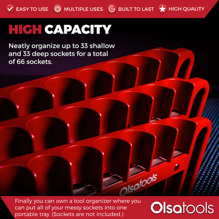 Store up to 26 sockets in the 1/4" drive, 28 sockets in the 3/8" drive, and 22 sockets in the 1/2" drive.