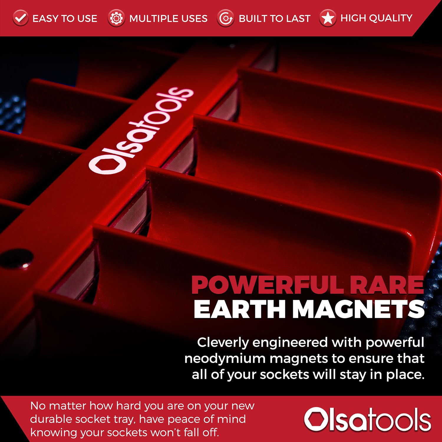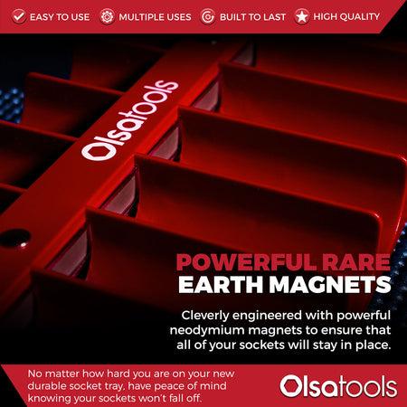 Whether in your drawer or mounted on your toolbox, our tray keeps your sockets secure. The powerful magnetic base holds your sockets in place on any steel surface, even when turned upside down.