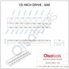 • 1/2" Drive SAE: 3/8, 7/16, 1/2, 9/16, 5/8, 11/16, 3/4, 13/16, 7/8, 15/16, 1, 1-1/14, 1-1/8, 1-3/16, 1-1/4 inch