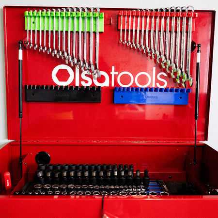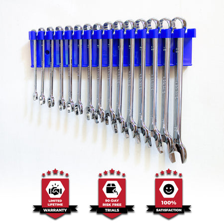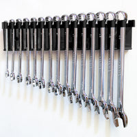 - Holds 15 wrenches securely, yet easy-to-remove when needed