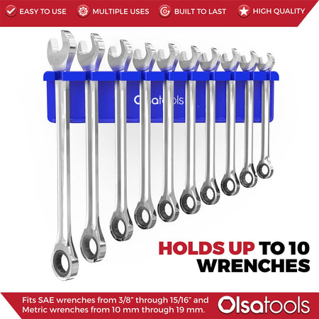 Our Magnetic Wrench Holder securely holds up to 10 SAE or metric wrenches, keeping them easily accessible and organized.